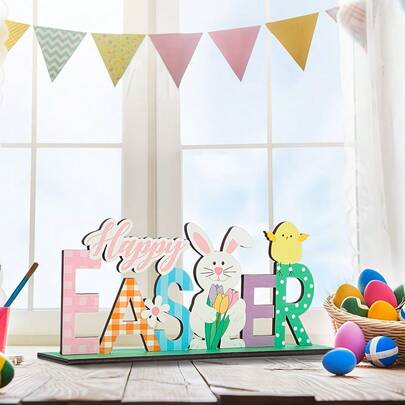 1 Piece Of Easter Wooden Decoration, Charming Easter Bunny And Chick Wooden Tabletop Ornament - Colorful "Happy Easter" Letter Decoration With Banner And Eggs, Perfect For Spring Celebrations, Easter Party Decorations, Bunny Accessories, And A Perfect Easter Gift - Multicolor - View 1