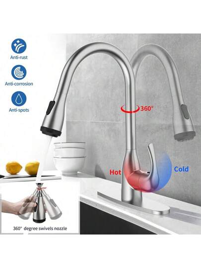 1 Set 304 Stainless Steel Faucet With Zinc Alloy Handles, Dual Water Outlets, Rotatable Anti-Splash Design, Suitable For RV Kitchen & Home - Silver - View 1