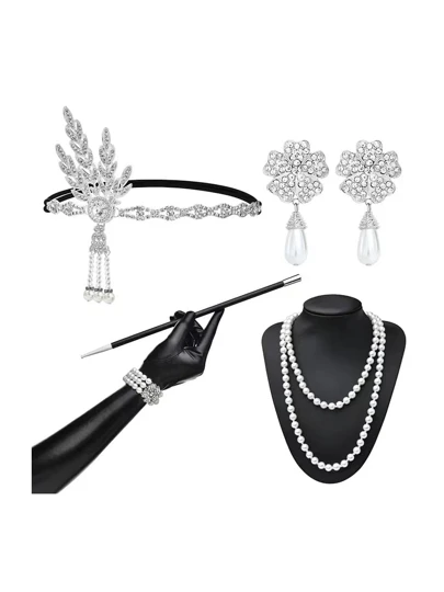 1 Set 6pcs 1920s Style Women's Crystal Studded Alloy Leaf Headband, Pearl Necklace, Pearl Bracelet, Pearl Clover Earrings, Gloves And Cigarette Holder Party Accessories Set - Multicolor - View 1