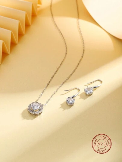 1 Set Classic Elegant Luxury Jewelry Set With Gift Box, Including Cubic Zirconia S925 Sterling Silver Stud Earrings And S925 Sterling Silver Necklace. Suitable For Birthday Gift, Ladies' Gift, Party Gift, Wedding Gift - Silver - View 1