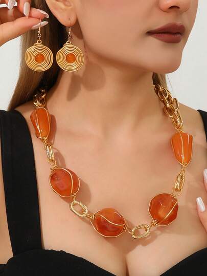 1 Set Exaggerated Multi-Layer Handmade Aluminum Wire Woven Resin Acrylic Chain Bohemian European And Middle Eastern Style Necklace And Earrings, Elegant High-End Jewelry Set For Party, Vacation - Chinese Coffee - View 1