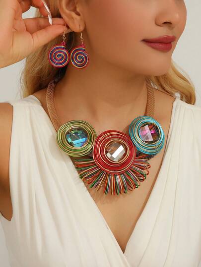 1 Set Exaggerated Multi-Layer Handmade Bohemian European & Middle Eastern Style Artificial Crystal Necklace & Earrings, Suitable For Evening Party, Vacation - Color - View 1