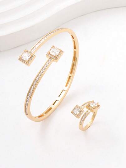1 Set Fashionable Minimalist Twin Square Crystal Zirconia Bracelet & Open Ring Set For Women - Gold - View 1