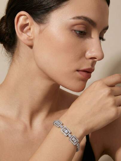 1 Set Luxury Elegant Cubic Zirconia Inlaid Rectangular Design Bracelet, Suitable For Women's Wedding & Party Wear, Excluding Gift Box - Silver - View 1