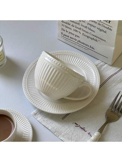 1 Set Retro Style Ceramic Coffee Cup & Saucer, Suitable For Latte, Cappuccino, Breakfast Milk, 1 Set (Cup + Saucer) - White - View 1