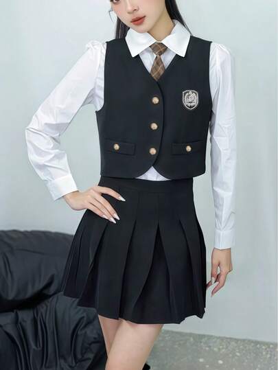 1 Set Vintage American-British School Style Uniform: Black Vest + Top + Pleated Skirt + Tie, Suitable For Cosplay, Costume Party, Graduation Photo, Date, Valentine's Day - Multicolor - View 1