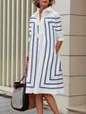 Geometric Pattern Polyester Midi Dress With Long Sleeve, Button Closure, Lapel Collar, Suitable For Beach, Evening, Office, Spring/Summer