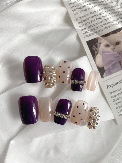 10PCS Press On Nails, Purple & Pastel Pink Rhinestone Design, Reusable Fake Nails For Party/Wedding, 4-Season Waterproof & Shiny Manicure,Valentine Nails,Purple Nails,Includes Jelly Gel And Nail File - Violet Purple - View 1