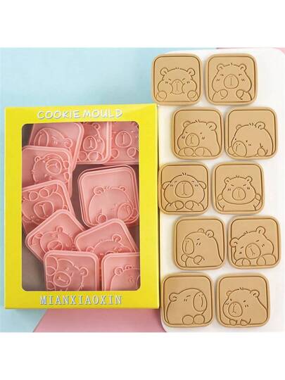 10pcs Capybara & Various Expression Cartoon Cookie Cutter Mold, 3D Press Biscuit Mold, Fondant Baking Tool Set - Pink - View 1