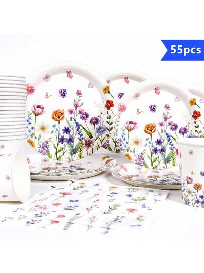 10pcs Colorful Floral Pattern Disposable Tableware Set - Includes Plates, Napkins And Cups, Suitable For 10 Guests, One-Time Paper Plates Party Supplies For Birthday, Wedding, Party, Family Picnic - Multicolor - View 1