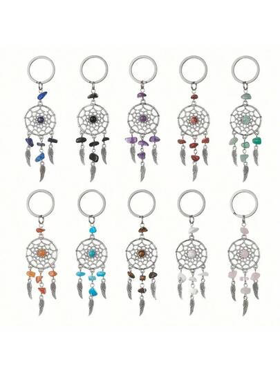 10pcs/Set Dreamcatcher Keychain Set, Assorted Natural Gemstone Wing Charms, Handmade Round Keyring, Suitable For Expressing Friendship And Love, Unique Gemstone Keyring Series, Ideal As Gifts Or For Special Occasions Christmas Bag Charms Car Accessories Teacher Sister Gift Ideas - 10Pcs Dreamcatcher - View 1