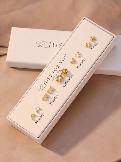 10pcs/Set Warm Golden Yellow Sweet 7-Day Earring Gift Box, 5 Pairs Of Unique Zirconia Heart / Flower / Bowknot Earrings Set, Exquisite Commuter, Ins Style, Suitable For Daily Matching / Holiday Gifts, Niche Gift Box, Whitening, No Repeat Earrings - Earring Set - View 1
