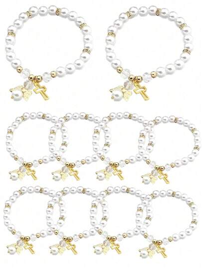 12 Hollow Cross Bead Elastic Bracelets, Suitable For First Communion, Wedding Ceremonies, Birthday Gifts, Baptism Gifts, Souvenirs - Multicolor - View 1