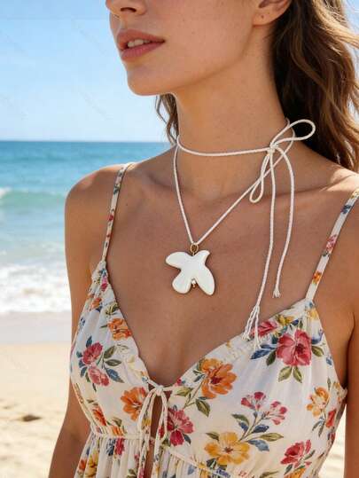 120cm Adjustable Rope Chain Ceramic White Dove Necklace, Women's Stainless Steel Pearl Beaded Long Necklace, Party Accessories - White - View 1