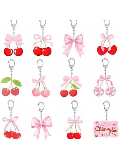 12Pcs Pink Bow Cherry Party Favors, Acrylic Pink Bow Keychains Bulk Coquette Girly Preppy Bridal Shower School Decorations Gifts For Back To School Wedding - 12 Pieces Per Set, Style C - View 1