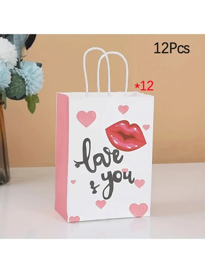 12pcs/Pack Cartoon Bear Printed Kraft Paper Bag For Valentine'S Day, Shopping, Wedding Decorations, Party Favors, Birthday Gifts, Proposals, Etc. - Lip Style - View 1