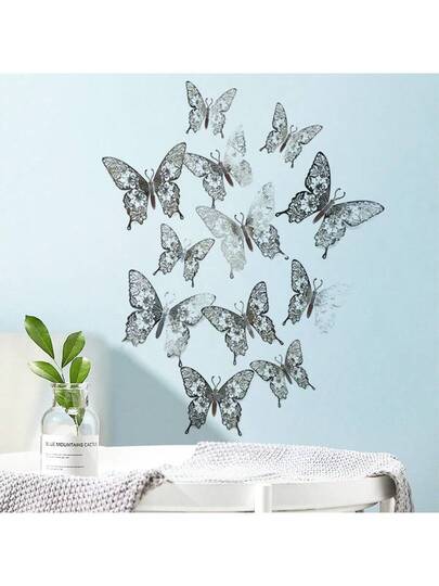 12pcs Silver And Champagne Color 3d Hollow Out Butterfly Wall Stickers, Can Be Diy With Faux Pearl And Suitable For Bedroom, Kids' Room, Study, Dining Room, Living Room, Office, Refrigerator, Etc. - Silver - View 1
