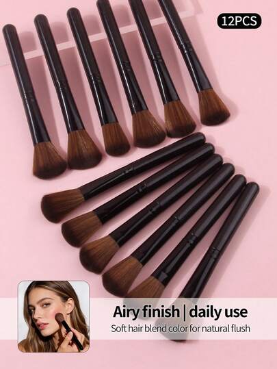 12pcs Soft Bristle Makeup Brush Set, Blush Brush, Powder Brush, Highlighter Brush, Contour Brush, Beginner Friendly Portable Cosmetic Tools - Black - View 1
