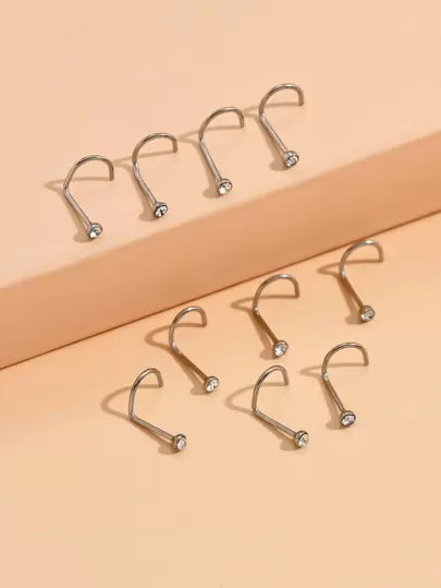 12pcs/set Fashionable Rhinestone Decor Nose Stud Stainless Steel For Women & Men No Piercing Needed Septum Body Jewelry - White - View 1