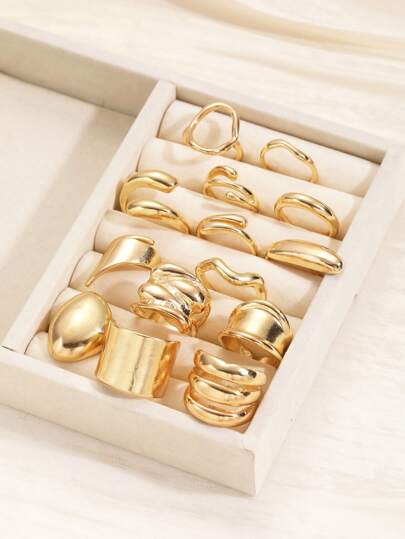 Set Of 3-14 Pcs Fluid Geometric Exaggerated Asymmetrical Chunky Metal Rings, Elegant Vintage Design Gifts For Holiday, Party, Dating, Daily Wear - Yellow Gold - View 1