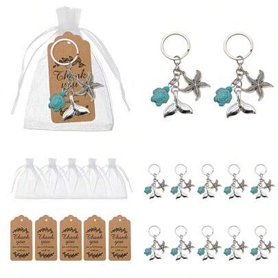 15 Pcs Faux Turquoise Keychain Set Turtle Mermaid Tail Starfish 5 Keychains 5 Mesh Bags 5 Paper Cards - Multicolor - View 1
