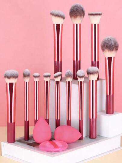15pcs Makeup Brush Set, Including Powder Brush, Blush Brush, Highlighter Brush, Eyeshadow Brush, Lash Brush, Eyeliner Brush, Angled Makeup Sponge, Round Makeup Sponge, Round Powder Puff, Triangle Powder Puff, Triangle Makeup Sponge For Loose Powder, Liquid Foundation Mixing Makeup Sponge, Beauty Makeup Tools - Burgundy - View 1