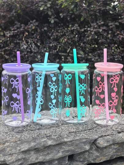 17oz Transparent PC Water Bottle With Straw, Suitable For Traveling Outdoors, Coffee Cup, Cute Bow Pattern, Gift For Her, Birthday - Multicolor - View 1