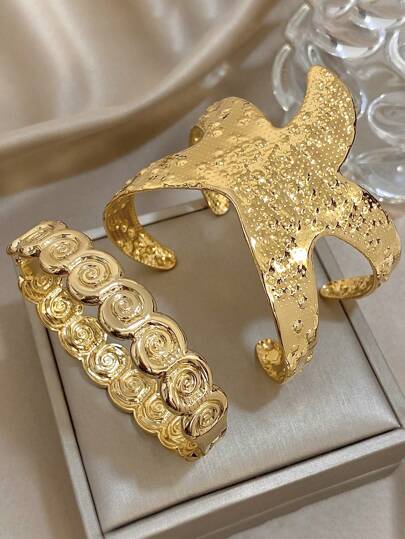 18K Gold Plated Stainless Steel Starfish & Spiral Shell Boho Ocean Art Vintage Bangle Bracelets Set For Women, Wear On Wrist, Not Arm, Elegant Mom Gift, Minimalism Teacher Gift, Summer Travel Beach Jewelry, Rave/Prom/Party/Daily Accessories, Back To School Gift, Birthday Gift, Bridesmaid Gifts, Mermaid - Multicolor - View 1
