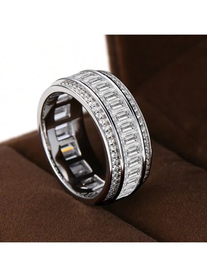 XUJIA 1pc 9mm Multi-Diamond Wedding Ring, Unisex 925 Sterling Silver Couple Ring, Inlaid With 2pcs 4mm Emerald And 1mm Round Cut Cubic Zirconia, Eternity Ring, Women's Engagement Ring - Silver - View 1