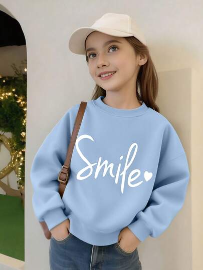 1PC Girls Fresh "Smile" Print Sweatshirt, Soft Fabric, Casual Outing Versatile Style - Blue - View 1