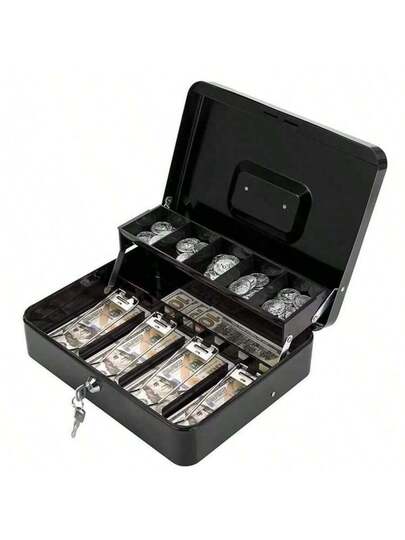 1PC Heavy-Duty Metal Cash Box With Key Lock - Secure Money Storage Box With Removable Coin Tray & 2 Keys - Portable Cash Box For Home, Office, Retail Shop - Double Layer Organizer For Bills, Coins, Valuables (Black) - Multicolor - View 1
