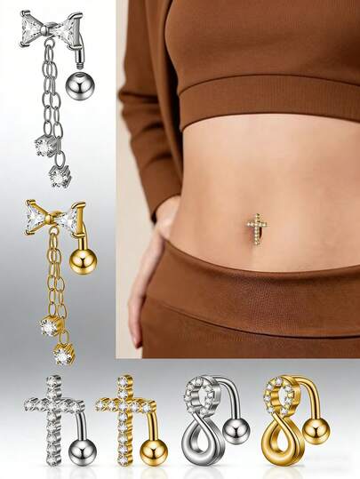 1PC Stainless Steel Reverse Zirconia Cross Belly Button Ring 14G Zirconia Dangle Reverse Navel Piercing Hook Piercings Jewelry - As Shown - View 1