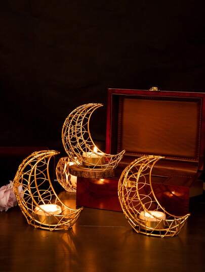 1Pc/Set Double-Arched Woven Star And Moon Metal Candlestick. Made Primarily From Metal Wire, This Candlestick Features A Minimalist Modern Design. Its Shape Is A Double-Layered Interwoven Crescent-Shaped Hollow Lattice Frame, Paired With A Circular Base, With Small Candle Trays Embedded In The Details - Multicolor - View 10