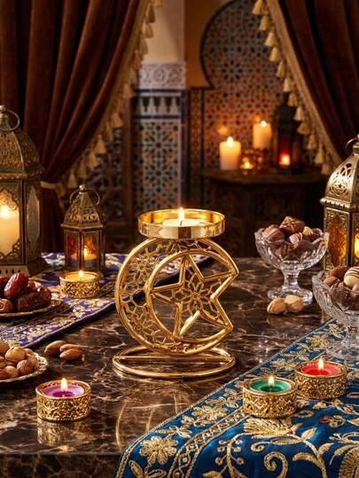 1Pc/Set Star And Moon-Themed Candle Holder. Made Of Bright Gold Metal Wire, It Is Crafted Into A Mesh Hollow Design. The Style Is Minimalist. Suitable For Decorating The Living Room Table Or Bedroom Vanity In A Light Luxury Retro Home, Creating An Atmosphere For Romantic Dinners Or Casual Tea Rooms; It Is Also Suitable For Holiday Decorations And Small Gatherings Featuring Star And Moon Cultural Symbols, Such As Eid. - Multicolor - View 9