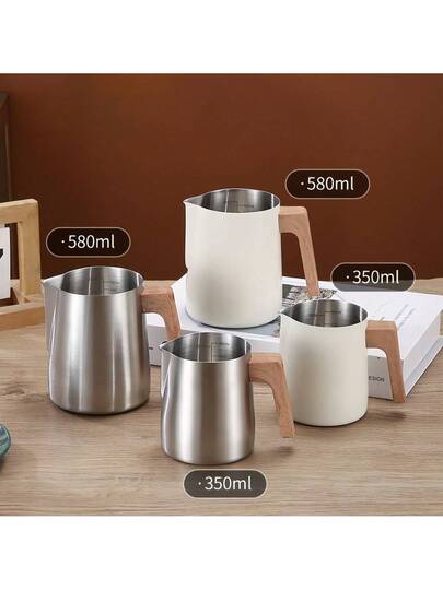1Pc Upgraded Anti-Scalding Wood Grain Handle Coffee Milk Frothing Pitcher Jug, 304 Stainless Steel, With Accurate Inner Scale, Eagle-Mouth Precise Control Of Milk Froth Flow Rate, Suitable For Beginners To Make Milk Froth, Professional Coffee Milk Froth Cup, Easy To Clean, Professional Grade Trowel Experience, Creating Dense Milk Froth, Office And Home Coffee Utensil 350/580ml Back To School - Multicolor - View 1
