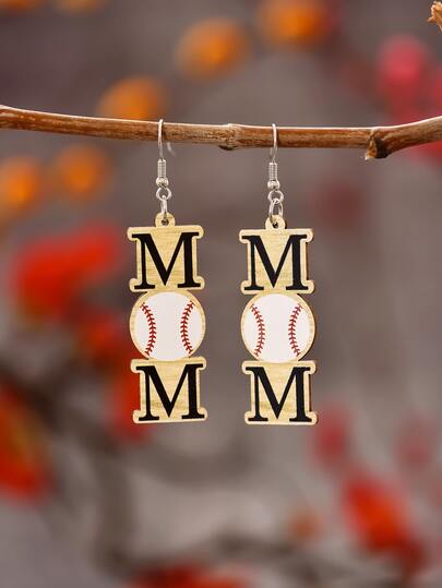 1pair Cute Cartoon Wooden Rectangle Shaped Mm Letter & Baseball Pattern Pendant Earrings For Women, Suitable For Parties, Dance Parties, School Season, Or As Holiday Gifts - Multicolor - View 1