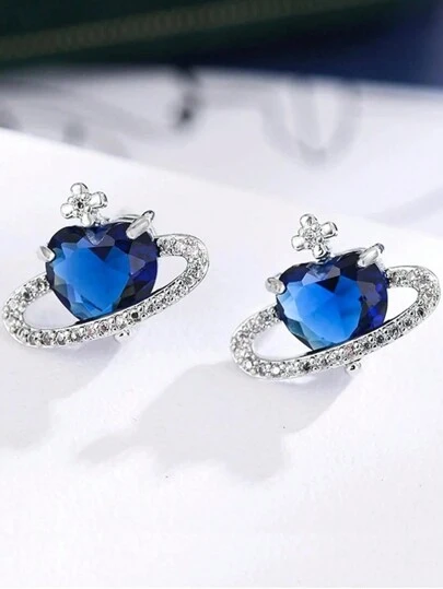1pair Fashionable Zirconia Planet Stud Earrings - Blue - View 1
