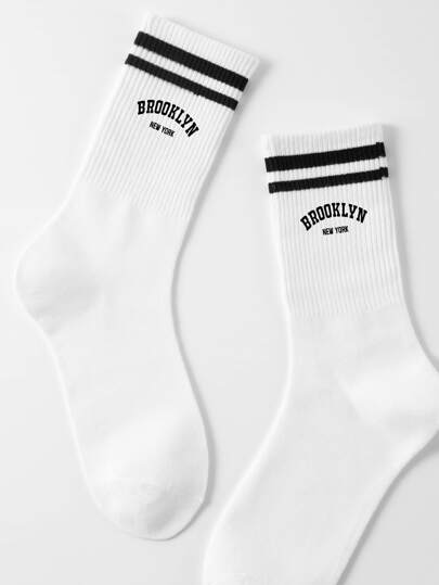 1pair Men's Mid Calf Basketball Socks, With Brooklyn Lettering Design In Black & White, Suitable For Daily Wear, Fall - Black and White - View 5
