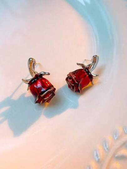 1pair Red Oil Drop 3d Rose Flower Earrings, Cute & Exquisite Design, Elegant & Romantic Gift For Women On Valentine's Day - Multicolor - View 13