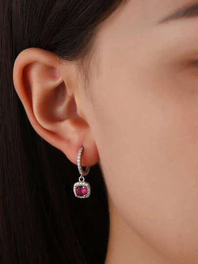 1pair S925 Sterling Silver Red Garnet & Cubic Zirconia Encrusted Women's Earrings, Fashionable Luxurious Versatile Women's Jewelry Gift - Silver - View 1