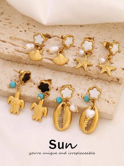 1pair Stainless Steel Five Leaf Flower Stud Earrings For Women Fashion18K PVD Plated Design Pearl Starfish Shell Pendant Earring Jewelry - Earrings - View 11