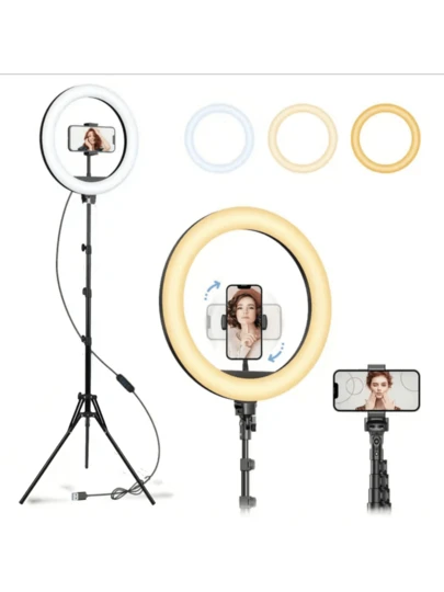 1pc 10 Inch Selfie Ring Light With Tripod Stand, LED Circle Light, With Flexible Tripod Stand & Phone Holder, For Photo Selfie Video Recording Zoom Meeting - Black and White - View 6
