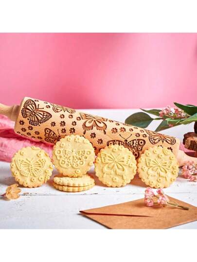 1pc 13.7inch Butterfly & Flower Pattern Wooden Rolling Pin, Suitable For Cookies, Biscuits, Festival Gifts - Brown - View 1