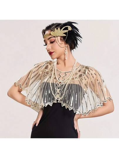 1pc 1920s Elegant Vintage Sequin Shawl, Beaded Embroidered Lace Trim Versatile Capelet Shawl, Breathable Women Party Dress Accessory Shawl/Bolero, Fashion Party Evening Gown Accessory - Multicolor - View 1