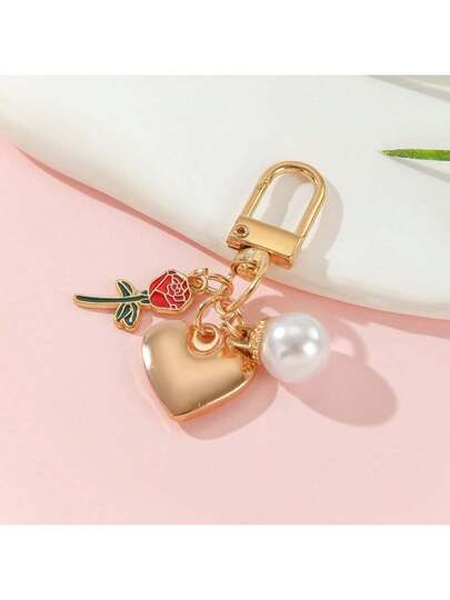 1pc 2024 Creative New Heart-Shaped & Peach-Shaped Keychain With Simple And Metallic Rose Flower & Pearl Charm As Friend Souvenir Gift. Can Be Used As Bag Pendant Key Chain Charms - Gold - View 1