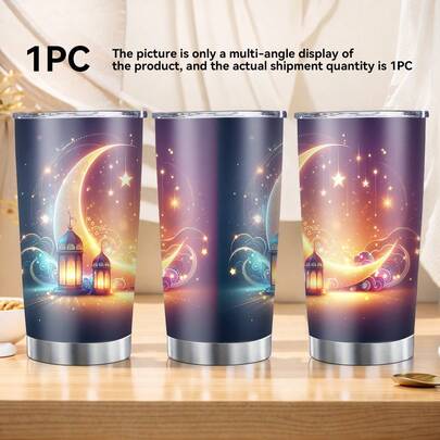 1pc 20oz Stainless Steel Insulated Car Mug. Featuring Islamic-Style Crescent Moon, Openwork Decorations, Lanterns, And Other Elements For Ramadan And Eid Al-Fitr. Suitable For Evening Celebrations And Traditional Muslim Festivals. A Wonderful Gift For Family And Friends On Holidays Or Birthdays. - Multicolor - View 1