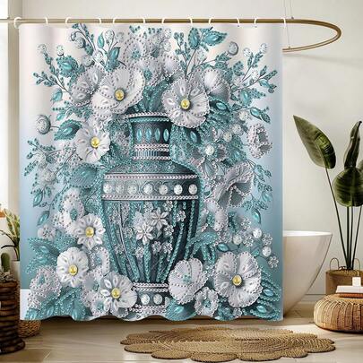 1pc 2D Diamond Flower Vase Printed Shower Curtain, Polyester Material, Waterproof, Non-Shading, Suitable For Home And Bathroom Decor, Comes With 12 Hooks - A - View 1