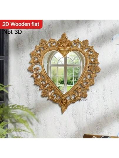 1pc 2D Flat Wooden Gold Mandala Heart-Shaped Mirror - Baroque Style - Gold Wall Mirror, Gold Decorative Mirror, Bedroom And Living Room Wall Decor | Luxury Wall Decor | Romantic Home Decor, 2D Flat - Multicolor - View 1