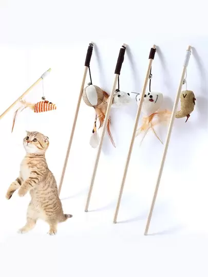 1pc/2pcs/3pcs Randomly Sent Handmade Feather & Linen & Wood Cat Teaser With Bell For Playing - Multicolor - View 1