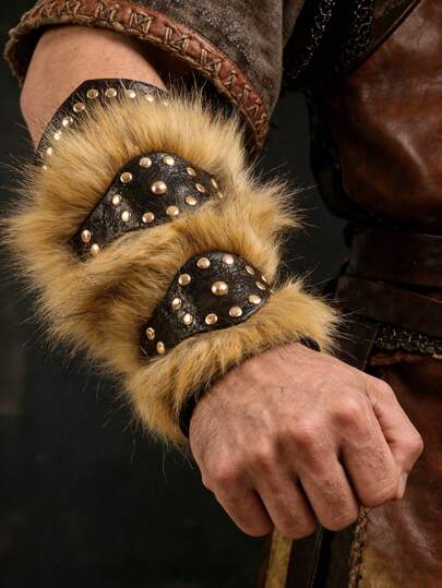 1pc/2pcs PU Leather & Faux Fur Wrist Cuffs, Steampunk Rivet Arm Warmers, Medieval Viking Cosplay Accessories For Men & Women - Black - View 13